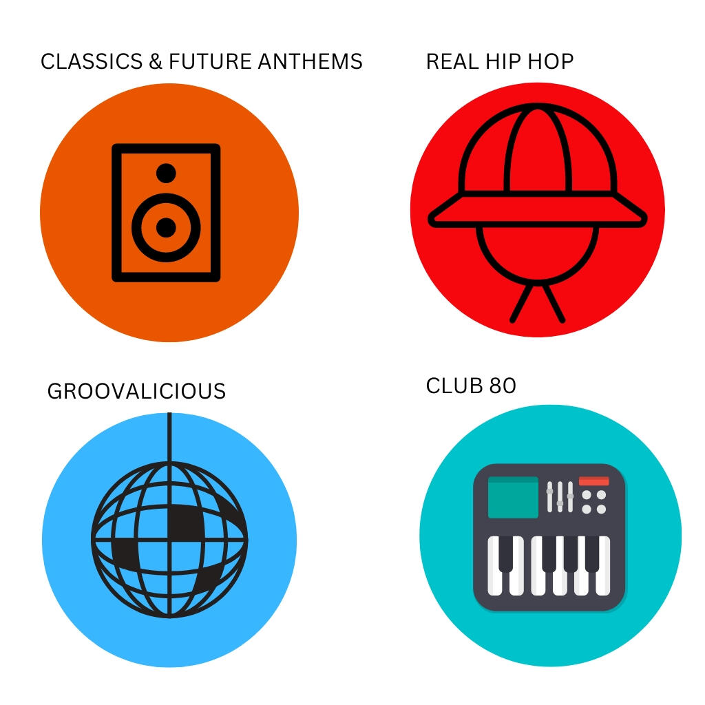 Step back into the club via our channels, (including rare tracks & remixes which are not on streaming services), House & Club Anthems (classics and fresh new club sounds), Real Hip Hop (old school Hip Hop), Groovalicious (Disco, Funk and NuDisco edits) & Club 80 (the dance floor sounds before the emergence of house music).